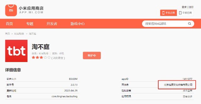 查询发现,《淘不庭》(版本 2.0.13,小米应用商店)由北京庭灏文化传媒有限公司开发。企查查数据显示,该公司是上海庭灏文化传媒有限公司的全资子公司,两公司的经理、执行董事、法定代表人均为匡桂媛。而匡桂媛正是上海淘不庭实业有限公司和上海淘不庭文化传媒有限公司的执行董事、法定代表人。其中,上海淘不庭实业有限公司是上海淘不庭文化传媒有限公司的全资子公司。在这两个公司中,林吉荣(林瑞阳)任总经理,张淑琴(张庭)任监事,而匡桂媛仅拥有两公司0.7397%的股权。