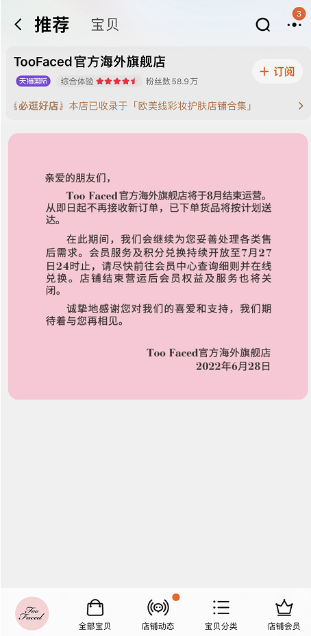 6月28日,天猫国际Too Faced官方海外旗舰店内发布一则公告称:店铺将于8月结束运营,即日起不再接收新订单,已下单的货品将按计划送达。会员服务和积分兑换将持续开放至7月27日。店铺结束运营后,会员权益及服务也将关闭。