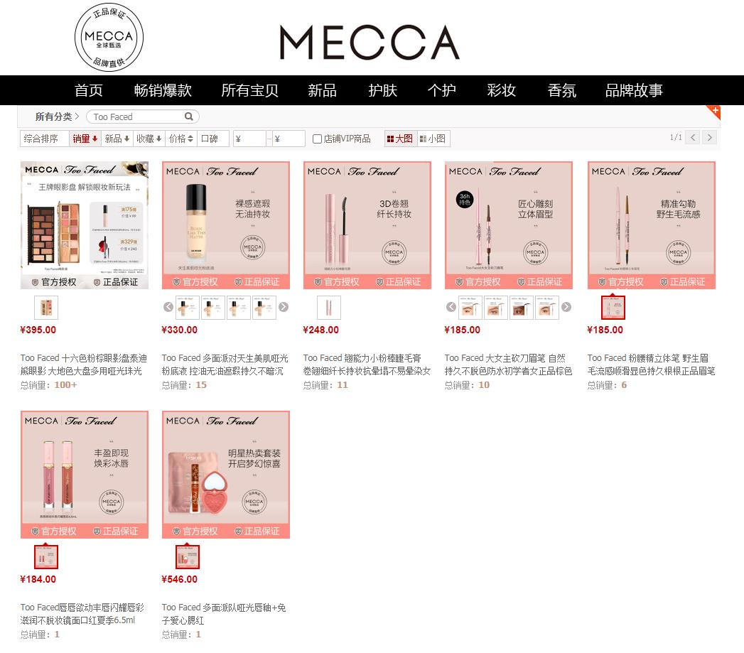 青眼发现,MECCA天猫国际海外旗舰店内,仅有7款Too Faced的商品,其中销售最高的是Too Faced十六色粉棕眼影盘,其总销量仅为100+笔,其余商品的总销量均未超过20件。