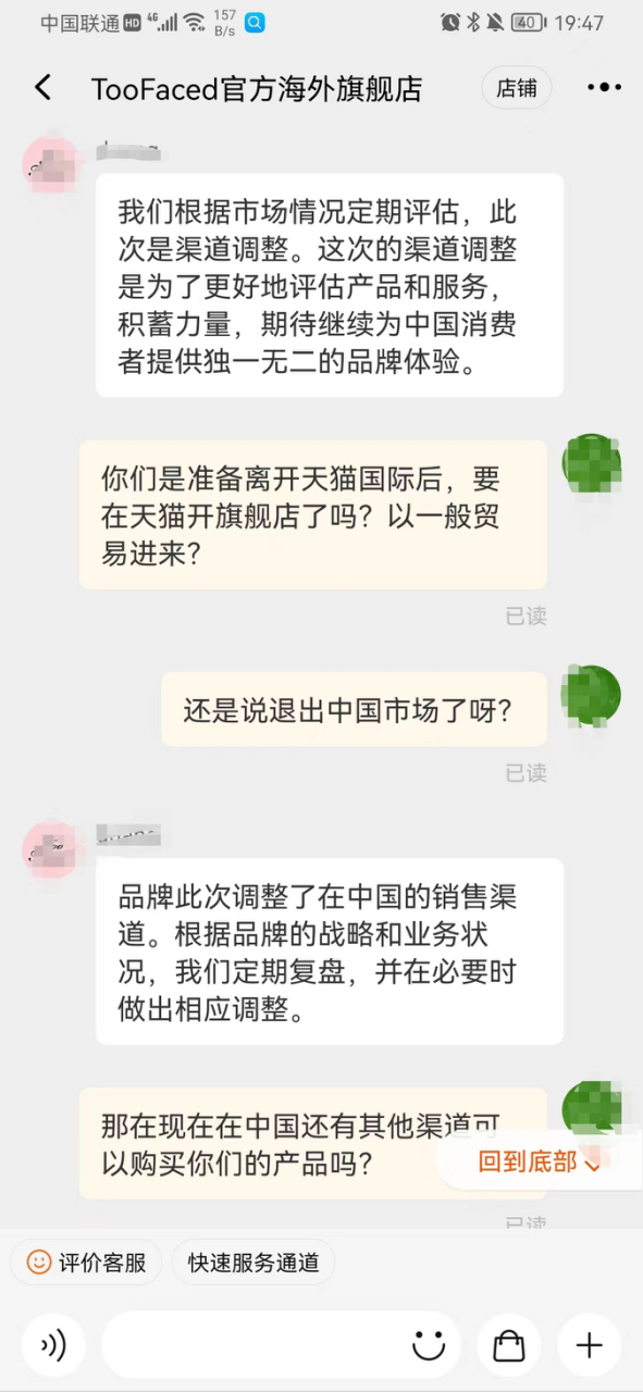 不过,据Too Faced天猫国际官方海外旗舰店客服称,“品牌此次是调整了中国的销售渠道。根据品牌的战略和业务状况,我们定期复盘,并在必要时作出相应调整。”并表示,“期待继续为中国消费者提供独一无二的品牌体验。”
