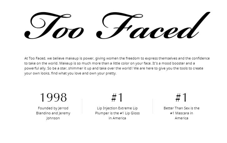 凭借强大的眼妆产品,Too Faced在市场上迅速站稳脚跟,有报道称,“世界上第一款大亮片眼影”就是出自Too Faced。而在雅诗兰黛集团官网上也宣称,该品牌旗下的2款产品分别是“美国排名第一的唇彩”和“美国性价比排名第一的睫毛膏”。