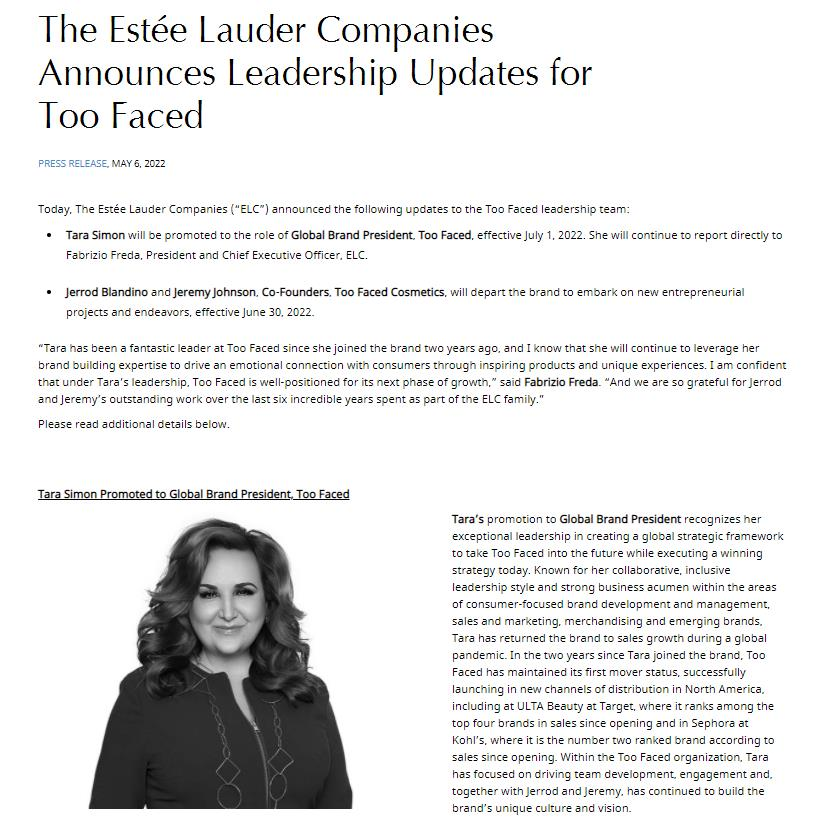 这一点从品牌换帅可窥知一二。雅诗兰黛集团官网信息显示,今年7月1日起,Too Faced将正式换帅,品牌的两位创始人将离开,全球品牌总裁一职将由Tara Simon担任,并直接向雅诗兰黛集团总裁兼首席执行官Fabrizio Freda傅懿德汇报。