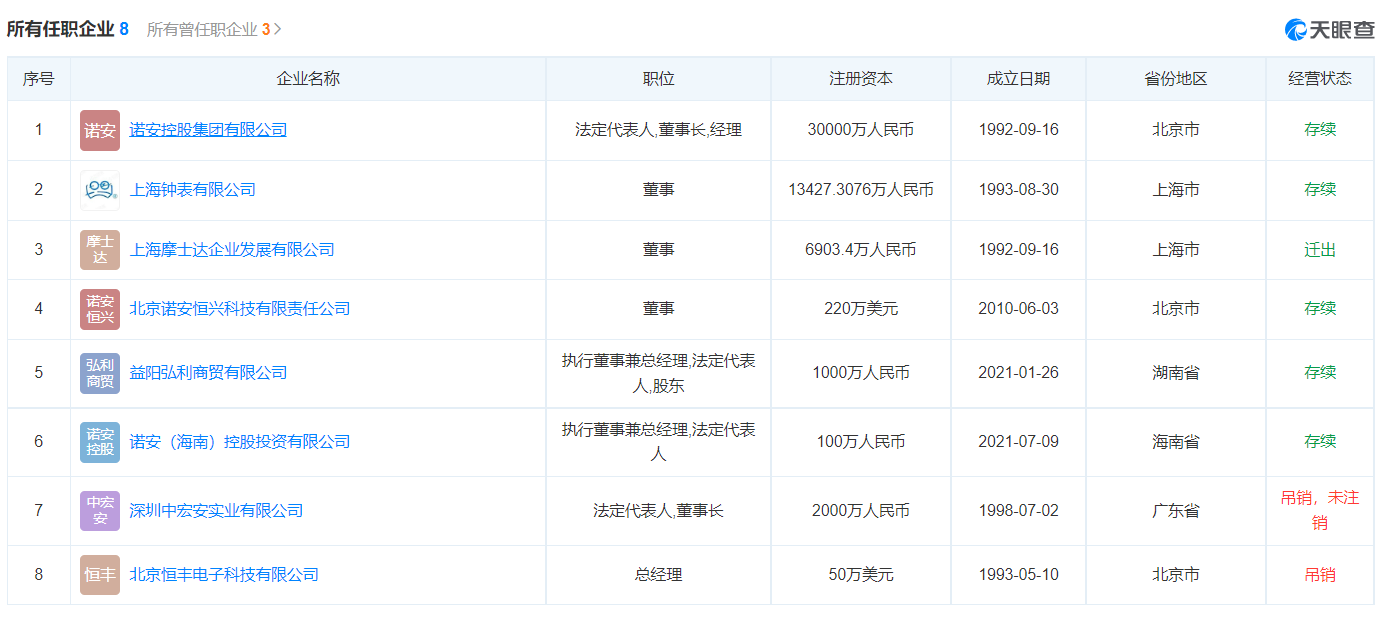 天眼查App显示, 秦某舟目前关联8家公司,其中6家为存续状态,包括诺安控股集团有限公司等。