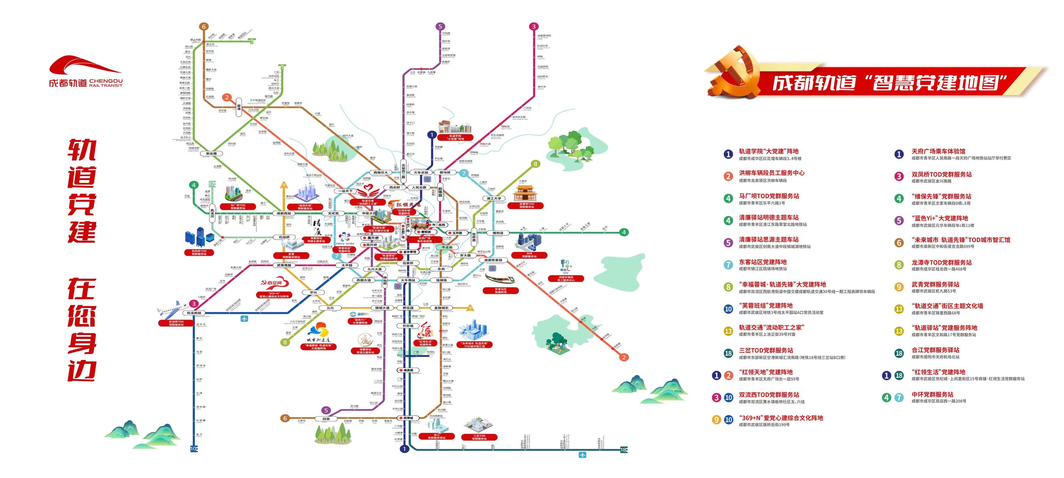 智慧党建地图编排科学精美,实现了指尖上的浏览。使用者不仅可以在成都地铁App移动端随时随地查阅地图,还可以在地铁站厅内按需自取,扫码详细了解轨道各党组织的基本信息。通过它,成都轨道的193个党组织点点星火散布在您身边,提供党组织报到、党员“双找”、共建联建等服务内容,通过信息列表实现党组织信息“一键查”;通过它,成都轨道的25个“大党建”阵地立即呈现在您眼前,提供学习教育、咨询交流、共享服务等资源平台,通过最优路径规划实现党建阵地“一键导”;通过它,成都轨道的123支党员志愿服务队围绕在您身边,提供卫生防疫、文明引导、便民帮扶等志愿服务功能,通过沟通联络实现匹配需求“一键帮”。