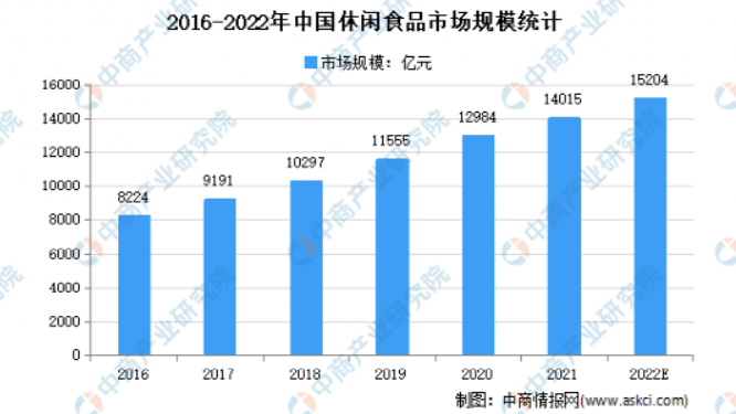 据统计,2016年至2020年,我国休闲食品行业市场规模从8224亿元增长至12984亿元,年复合增长率达12.09%。中商产业研究院预计,我国休闲食品行业市场规模在2022年可达15204亿元。