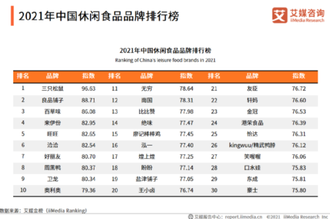 而且据2021年中国休闲食品品牌排行榜显示,相对于几十年来的老品牌来说的新品牌三只松鼠、良品铺子和百草味霸占了榜单前三,虽然卫龙居于第九位,但相比像王小卤这样的新晋品牌已经排列20,足矣引得各大消费者重视,尤其是容易替代辣条的卤味食品,更能引起卫龙的竞争。