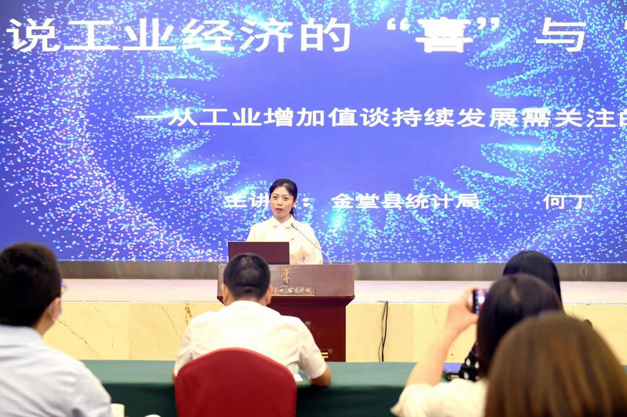 论坛中,金堂县统计局相关负责人以“数说工业经济的‘喜’与‘忧’——从工业增加值谈持续发展需关注的三个问题”为题作了主题宣讲,从“较高的工业经济贡献率”“超过50%的绿色制造产业占比”“规上工业的高位增长”阐释工业发展之“喜”,从“偏低的工业增加值率”“偏小的规上工业增加值”“工业投资后劲减弱”阐释工业发展之“忧”,最后提出“锚定新能源产业发展方向”“合理制定上规计划”“引进培育高附加值产业”三个策略方案。