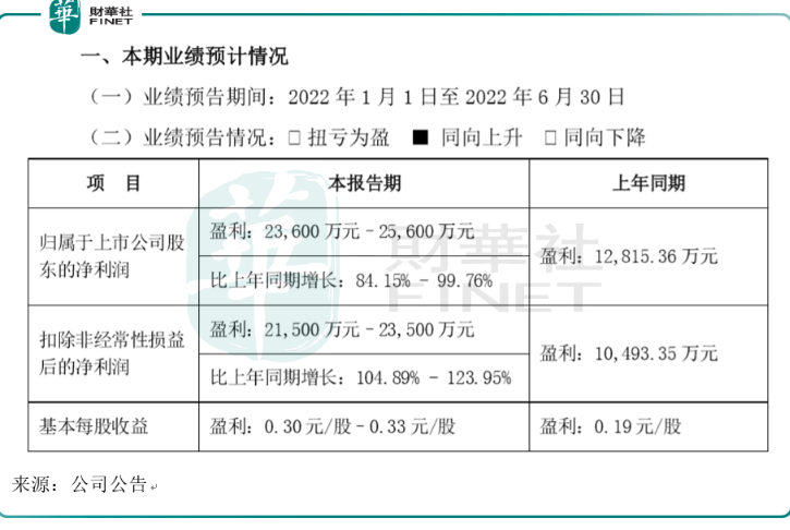 双环传动(002472.SZ)6月28日晚间发布2022年的半年度业绩预告,公司预计2022年1-6月归属上市公司股东的净利润2.36亿元至2.56亿元,同比变动84.15%至99.76%。而扣非净利润增速更是迅猛,同比增长104.89%-123.95%。