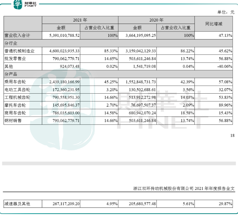总体来看,根据2021年的营业收入结构分析,乘用车齿轮产品占营收比重接近一半(45.25%),是公司最主要的产品。而其他三个产品所占比例相似:工程机械齿轮(14.66%)、商用车齿轮(14.58%)、钢材销售(14.66%)。以上几个产品构成了公司的主要营收结构。