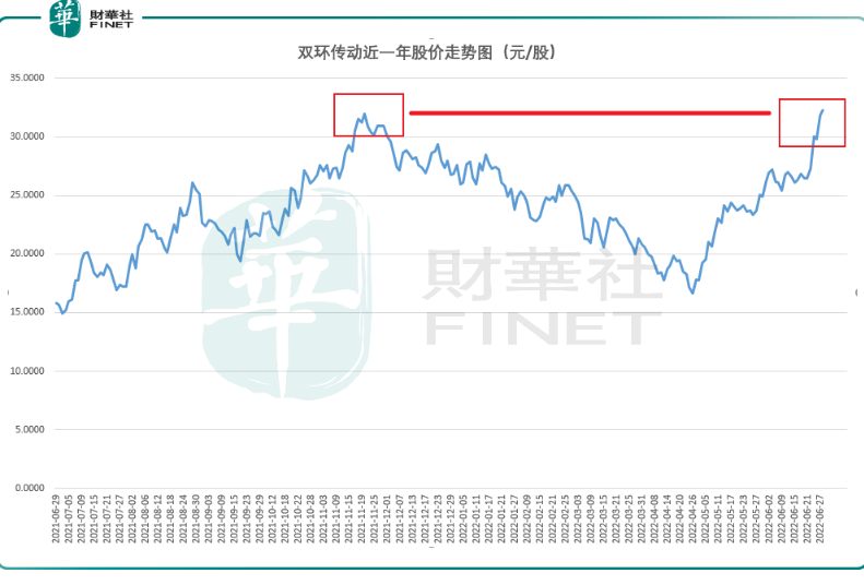 不仅业绩大增,在股价走势上,近期股价也接近去年11月以来的新高,下图是笔者查询的该股近一年走势图(前复权,收盘价)。可以看到今年上半年走了一个深V后,目前股价反弹已经达到阶段性的高点。但6月29日股价收跌4.68%,暂未冲过高点。截至2022年6月30日10点25分,双环传动二级市场股价为31.2元/股,涨幅为1.52%,继续向去年11月份高点33.16元发起冲击。