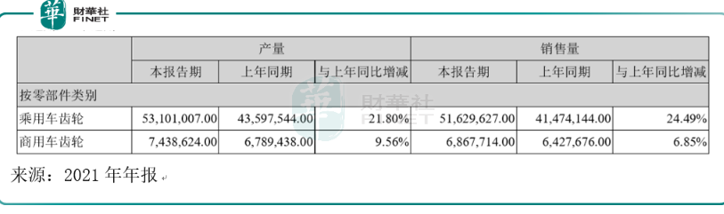 此外,从2021年的产销量来分析,在汽车齿轮按零部件分类上来看,公司更倾向于乘用车齿轮。