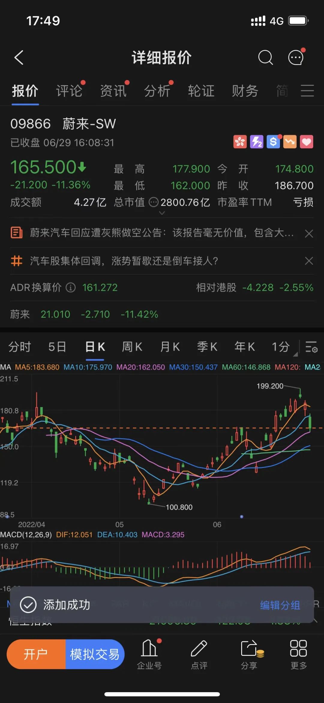 消息一出,蔚来股价迎来暴跌。今日港股收盘价为165.5港元每股,跌幅高达11.36%,市值蒸发超300亿港元。