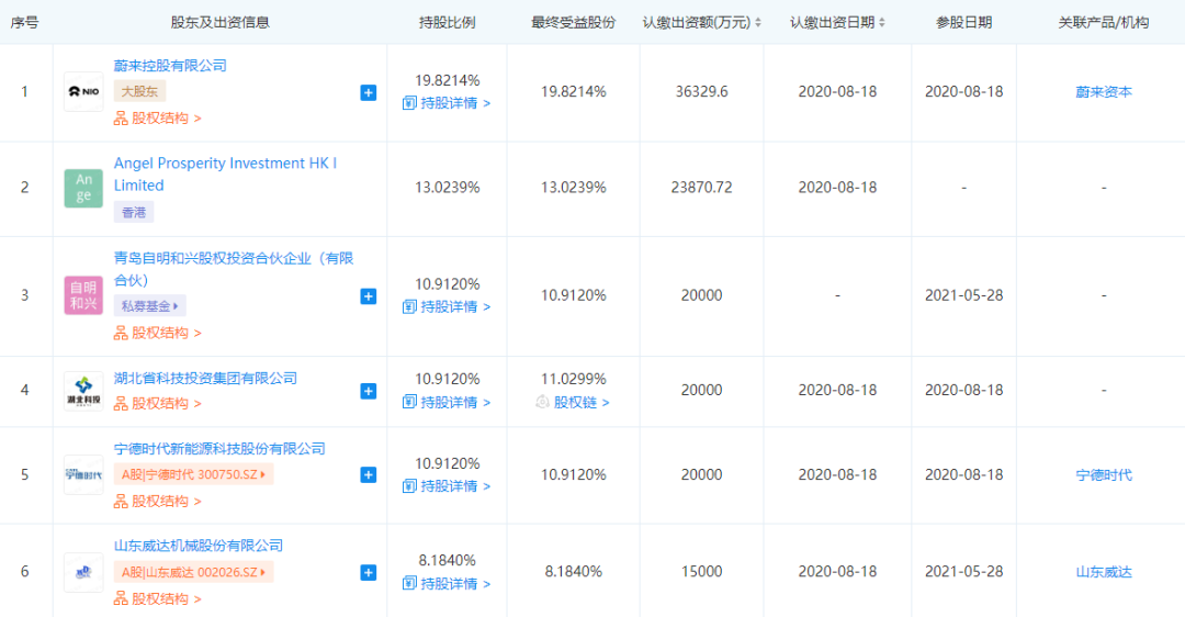 尽管蔚来是其第一大股东,但持股仅为19.82%,10%以上的股东还有4个。