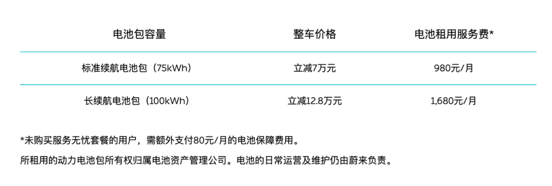 这是蔚来的一项“商业创新”,选择该服务后,你买到的蔚来汽车是不带电池的,价格也便宜至少7万元,之后每月缴纳980-1480元的电池租用服务费,即可享受“充电、换电、升级”等一系列服务。