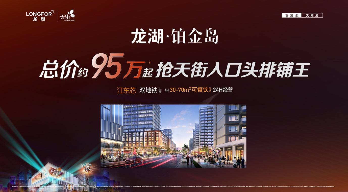 年中冲刺,龙湖·铂金都带来仅以总价约95万起,入主江东芯、双地铁(规划),建筑面积约30-70㎡的天街入口头排铺的特惠机会,可谓是超级让利,让你轻松执掌宁波繁华芯,做东超级天街商圈,臻席有限,错过再无。