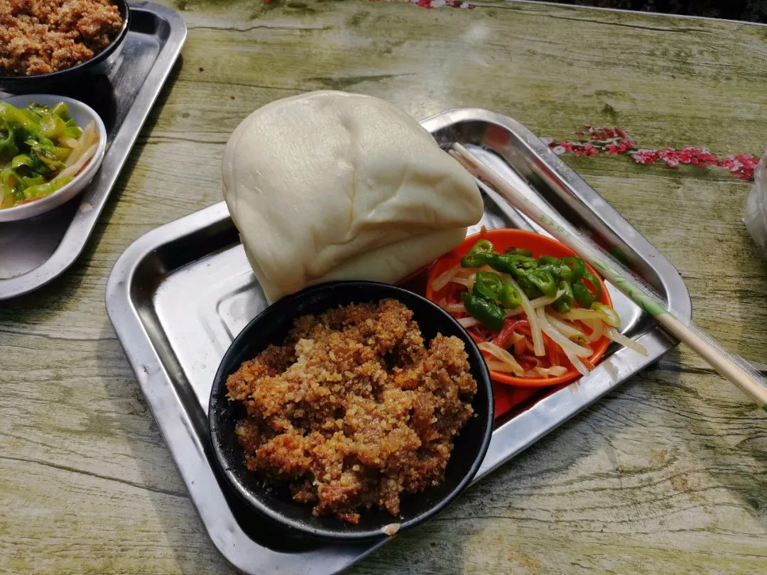 除了“白吉饼”和“油酥千层馍”外,咸阳本地大多数早餐店也会选择以白面蒸馍配上“腊汁肉”来当做肉夹馍。这样吃起来柔软不费劲,也有利于消化,备受“不喜欢硬食”消费者的青睐。