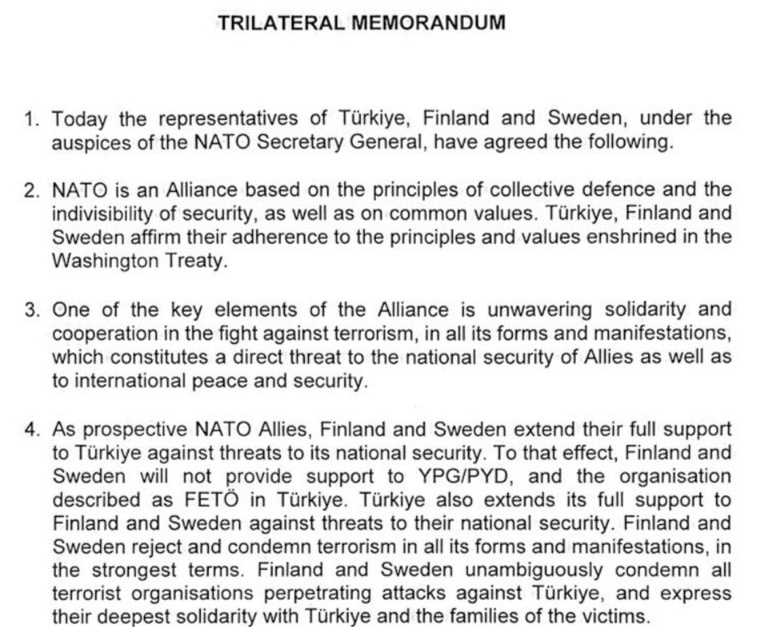 这份三方备忘录共有10项内容,包括芬兰和瑞典“确认”库尔德工人党是恐怖组织,承诺阻止该组织及其分支在两国的活动;芬兰和瑞典承诺不为YPG和居伦运动提供支持,两国将谴责所有恐怖组织对土耳其发动的袭击;芬兰和瑞典将回应土耳其关于引渡恐怖组织嫌疑人的要求;芬兰和瑞典停止对土耳其的武器禁运。