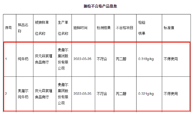麦趣尔纯牛奶不合格,两批次牛奶检出丙二醇