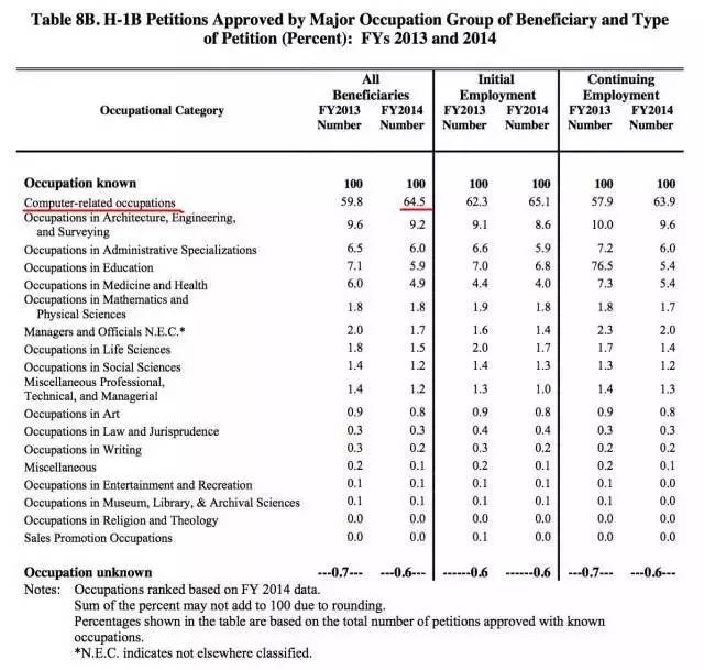 表六&表七:2013-2014财年,H1B申请人专业和雇主所处行业统计。截止到2014财年,计算机相关专业仍然牢牢盘踞在H1B获批专业的榜首,通过率高达64.5%。