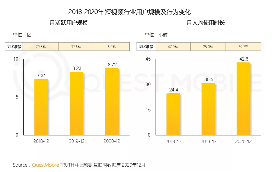 QuestMobile数据显示,截至2020年12月,国内短视频用户规模同比增6%至8.72亿,月人均使用时长为同比增39.7%至42.6小时。而长视频平台,则出现了下滑的趋势。数据显示,2020年9月,在线视频全行业月活已经从去年的9.26亿下降到8.45亿,渗透率都同比下滑8.4%。