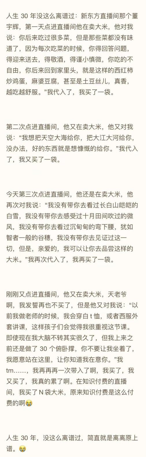 四袋大米,不仅能承载一家人几月的温饱,现在更是成为了一个热梗,与一个风风雨雨、起起伏伏二十年的名词——新东方,联系在了一起。