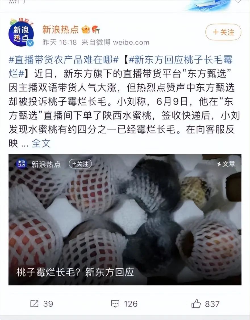 东方甄选是做农产品起家的,即便在爆火之际,也是多以农产品为带货内容。但是问题也来了,以前不火,一箱桃子慢慢挑慢慢发,都没问题。