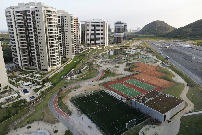 里约奥运村预计将容纳1.7万名来自世界各地的运动员,从外面可以看到,村里建有网球场和足球场等户外活动区域。