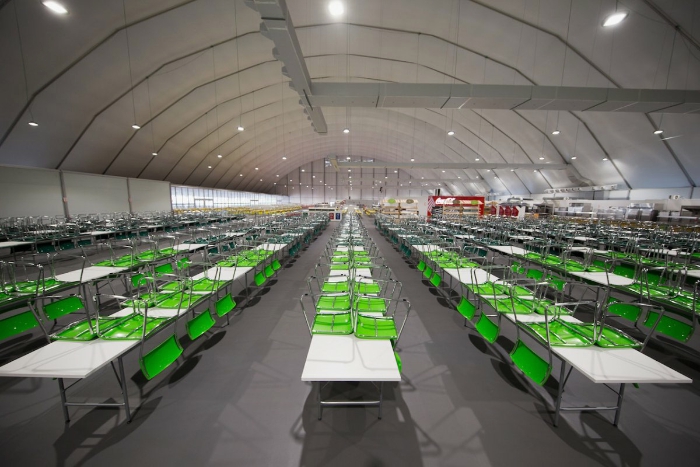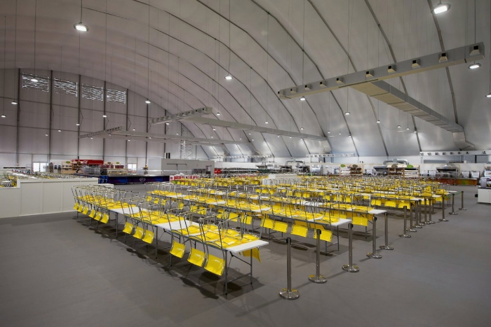 里约奥运村餐厅非常大,超过了两个足球场的面积,用巨大的帐篷将其覆盖,可容纳至少5000人同时就餐。