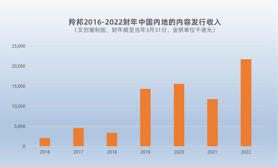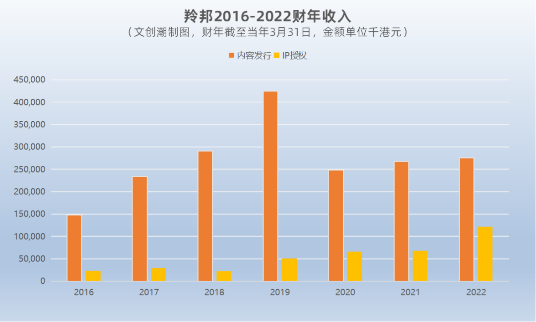 通过查阅往期业绩数字,文创潮注意到,羚邦的内容发行在2019财年猛涨,第二年同比减少41.4%,此后趋于稳定;IP授权的收入,2022财年相比于2018财年的2275.4万港元,四年增幅436%。