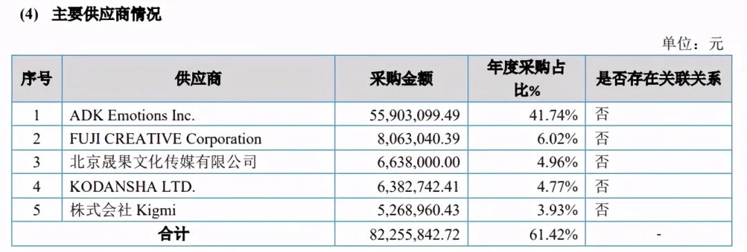 2020年,杰外动漫最大的供应商是ADK,其次是富士电视台旗下版权分销公司。这一年杰外动漫向ADK、富士、讲谈社采购金额分别为5590.3万、896.3万、638.27万元。