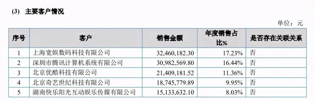 2020年,杰外动漫披露的前五大客户分别是B站、腾讯、优酷、爱奇艺、芒果TV,分别贡献销售额3246.02万、3098.26万、2140.92万、1874.58万、1513.36万元。
