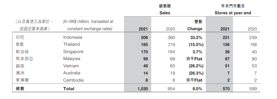 根据佐丹奴财报,2021年末,佐丹奴全球销售点有2056个,国内海外各占一半。从数据上看,佐丹奴和周大福进驻的海外国家重合度过高,而且佐丹奴在印尼、马拉西亚、泰国、新加坡等市场的门店,如果周大福能够嫁接资源,则直接免去了周大福开拓市场的周章。