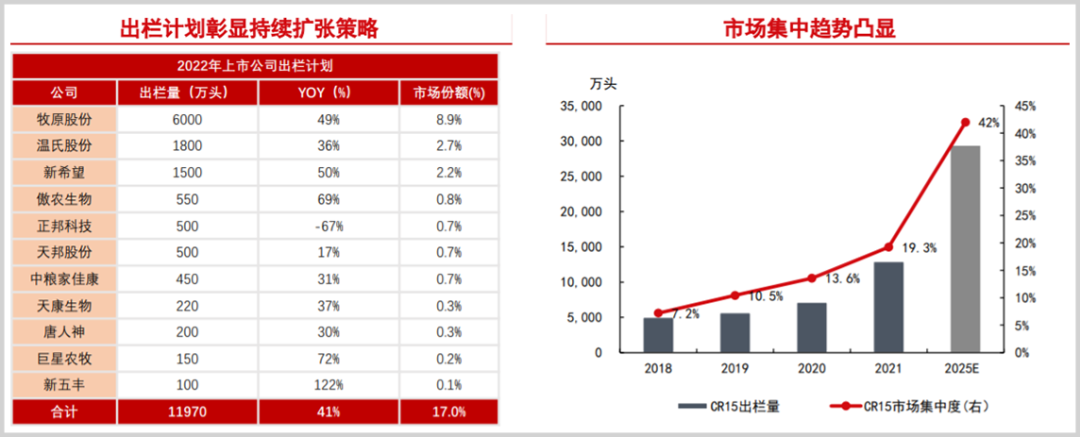 另外,据中信期货统计,寒冬之下,多家上市公司仍然延续扩产趋势,且幅度并不算小。2022年牧原、温氏、新希望至少在30%以上。同时扩产也将是未来主流,预计2025年行业CR15市占率将快速提升至42%!