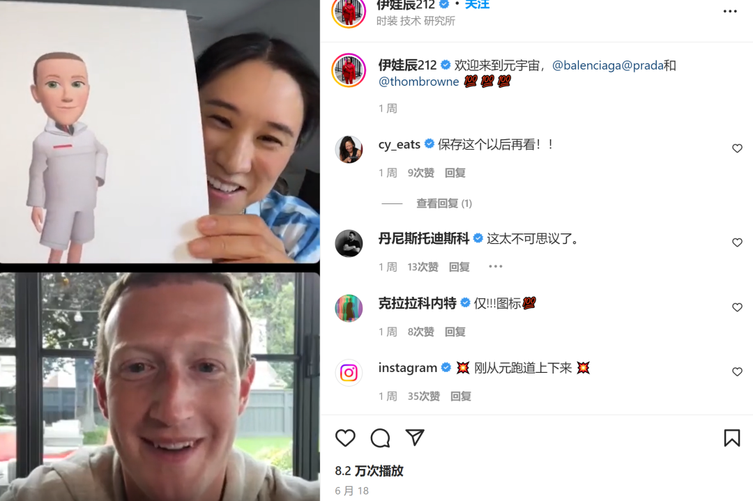 这些数字服装以Instagram时尚合作总监Eva Chen和Zuckerberg的Meta 3D化身为蓝本:Chen穿着意大利奢侈品牌Prada2022年秋冬系列中的背心和裙子,而Zuckerberg则放弃了他标志性的衬衫穿上了Balenciaga摩托车西装和Thom Browne定制服装。
