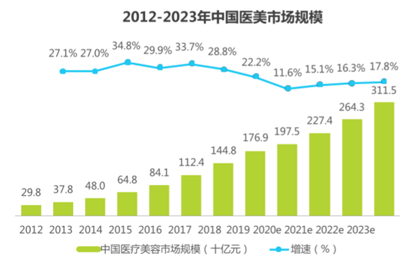 爱美之心人皆有之,在科技发展飞速的今天,可以变美的手段太多,医疗美容便是其中之一。那么如今的医疗美容市场有多大?根据此前艾瑞咨询发布的《2020年中国医疗美容行业洞察白皮书》显示:2019年中国医美市场规模达到1769亿元,预计到2023年市场规模将达到3115亿。