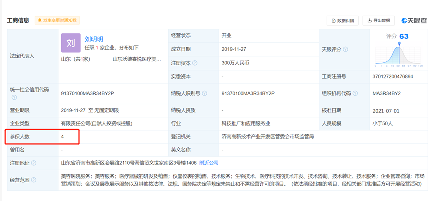 此外,山东沃德喜悦医疗美容有限责任公司参保人数仅4人,招聘信息学历要求显示,美容整形科医生要求为大专,其他招聘职位学历要求为初中至大专或不限。