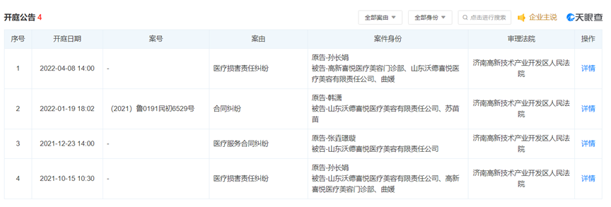2021年至2022年,山东沃德喜悦医疗美容有限责任公司共发生四起案件纠纷,包括医疗损害责任纠纷、医疗服务合同纠纷、合同纠纷等,被执行总金额11.3w。