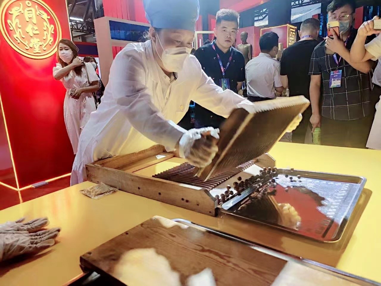 西湖会上同仁堂展位前热闹非凡,“这也太神奇了,你们发布的手工精品安宫牛黄丸就是这么搓出来的吗?”北京市劳动模范、非遗传承人郭凤华和徒弟正在展示安宫牛黄丸传统手工搓丸技艺,被参展者层层围住,郭师傅一边搓丸,一边给大家讲着关于安宫牛黄丸的故事,“做好药丸讲究‘圆光亮’,圆度要均匀,色泽要一致,别看这一丸只有3克,但是有着严格的工艺要求,做药是救人的活儿,丝毫不容马虎”。