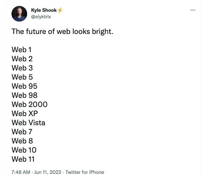 Web5的出现更引起网友的各种脑洞大开。在推特上下一代Web名字的投票活动中,Web11 Pro Max得到了最多的票,很多人调侃,接下来Web将跟苹果iPhone一样,会有6、6s、Pro、Pro Max等各种“型号”。