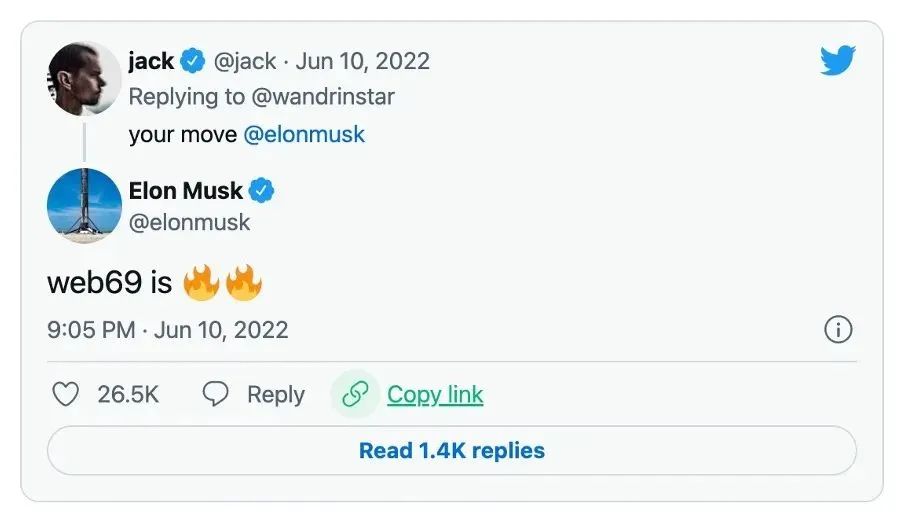一位推特用户表示,“如果杰克·多西和比特币可以创建Web5,那么狗狗币也可以创建Web69。”杰克·多西转推回复并反手@了马斯克表示“ Web69就靠你了”,马斯克这次仍然跟多西站在同一战线,他回复道:“Web69的想法会火起来”。