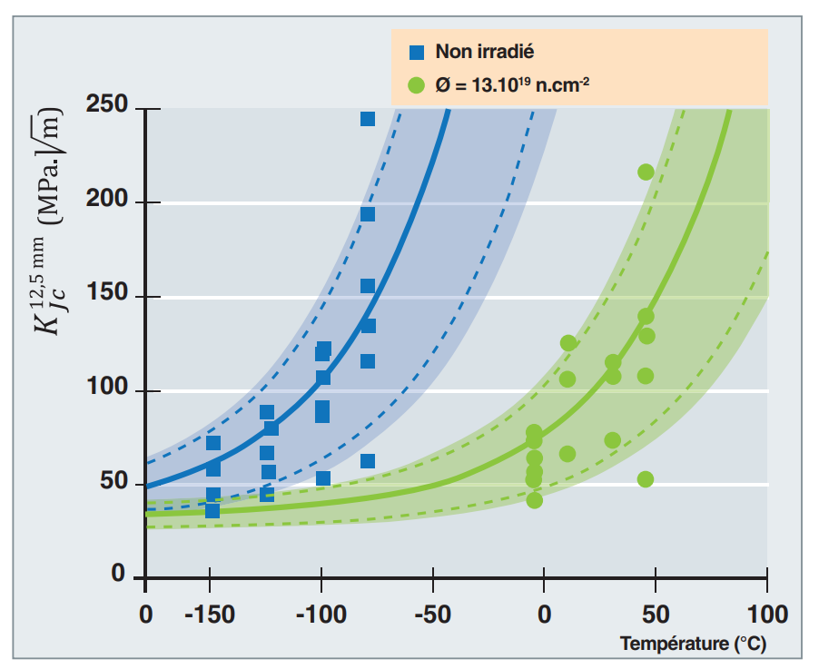 压水反应堆容器钢材硬度,蓝色代表辐照前,绿色代表辐照后 [2] CEA