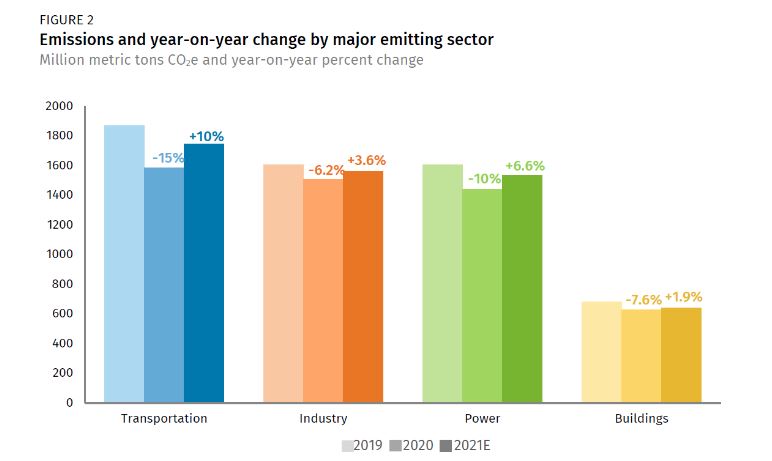 排放增加主要是由于燃煤发电增加——比2020年上涨17%,以及陆路交通运输复苏。鉴于此,美国的减少温室气体排放进度出现后退。2020年的排放相比2005年减少22.2%,但2021年相比2005年仅减少了17.4%。
