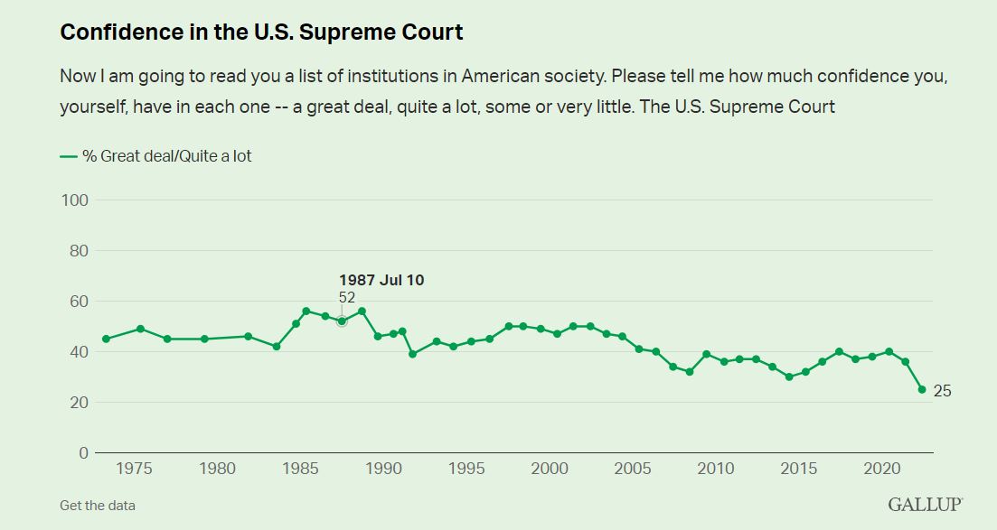民调显示,只有25%的美国成年人对最高法院有“很高”和“相当高”的信任,为该公司有调查以来的最低。