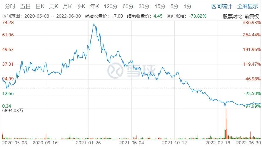 截至6月30日,金山云收报4.45美元/股,较两年前17美元/股的IPO发行价,已经跌去73.82%。