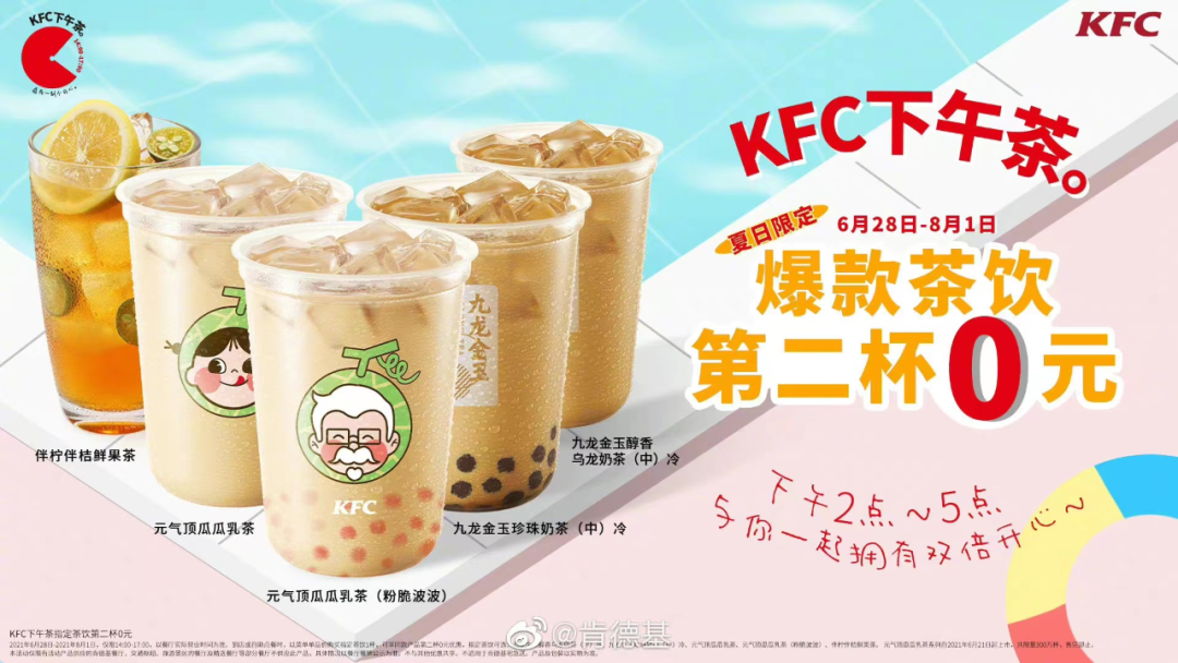 在产品宣发上,肯德基曾动用多位明星代言人做茶饮新品宣传,还和国产动画、电视剧IP联名发起买奶茶送周边活动。肯德基惯用的促销方式“第二杯0元”,常用于茶饮产品,此外也经常搭配店内小食、新品茶点做下午茶套餐,以拓宽茶饮的销售场景。