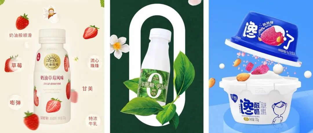 北海牧场宝石瓶酸奶、乐纯0系列小绿瓶、纯甄馋酸奶;图片来源:品牌官方微信公众号
