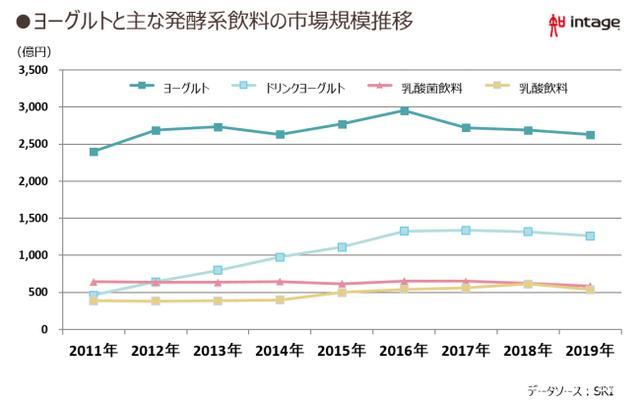 两种蓝色折线分别代表勺吃型酸奶和饮用型酸奶;图片来源:prtimes.jp