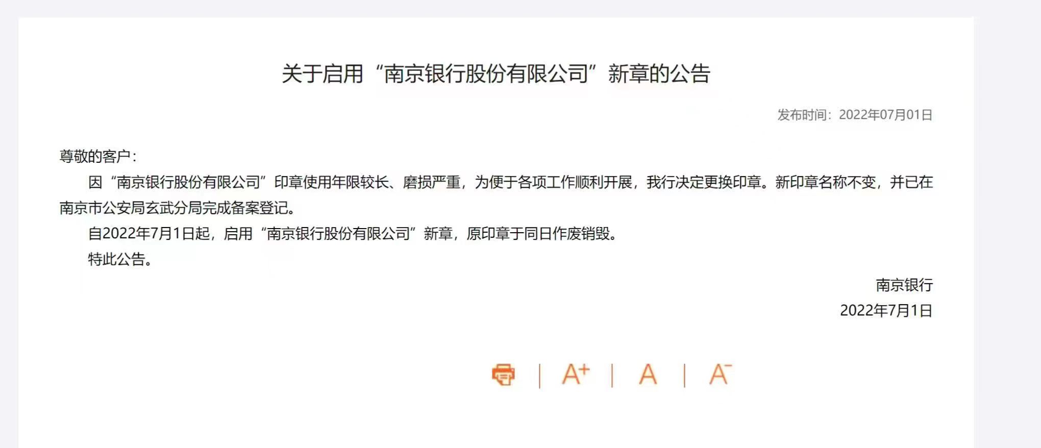 此外,南京银行在官网发布启动新章的公告。公告称,因“南京银行股份有限公司”印章使用年限较长、磨损严重,为便于各项工作顺利开展,我行决定更换印章。新印章名称不变,并已在南京市公安局玄武分局完成备案登记。自2022年7月1日起,启用“南京银行股份有限公司”新章,原印章于同日作废销毁。