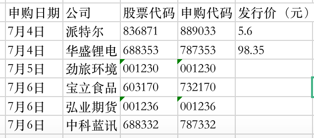 7月5日周二的话,有劲旅环境(001230.SZ)申购上限为1.1万股,顶格申购需配市值为11万元;7月6日的周三有3只,宝立食品(603170.SH)申购上限1.2万股,顶格申购需配市值为12万元;弘业期货(001236.SZ)申购上限3万股,顶格申购需配市值为30万元;中科蓝讯(688332.SH)申购上限8500股,顶格申购需配市值为8.5万元。