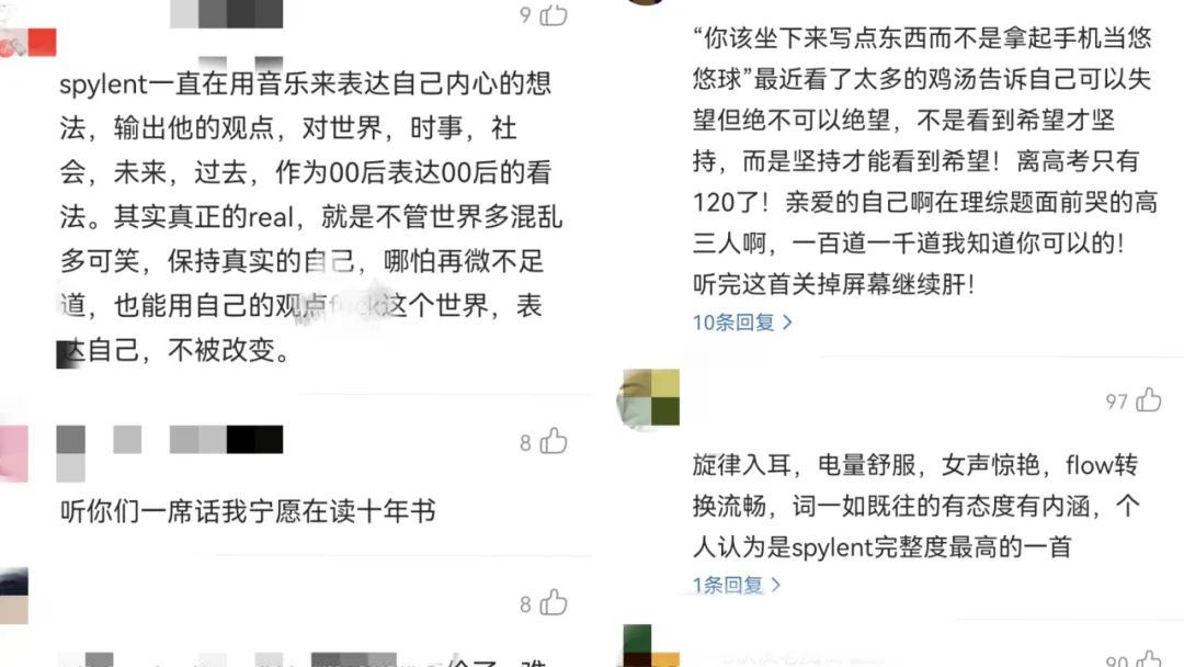 对于受众来说,说唱是寻找认同感、表达自我的一种方式,同为Z世代的高校说唱歌手们在共情上优势明显。可以看到,很多年轻rapper发表了不少讲述年轻一代的个性、责任与反思等的作品,在这之中处于“意见领袖”的地位。这也就不难理解,为何刚升入大学的00后说唱歌手Spylent,所写出的《表达者》《恶贯满盈》等歌曲能够在00后群体中获得极大反响。